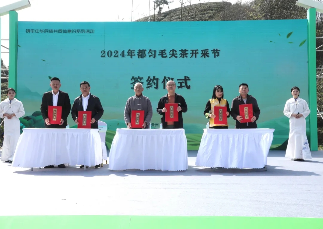 仪式上,有关领导还为国家级生态农场进行了授牌、颁发了都匀毛尖茶十佳销售企业奖和都匀毛尖直播达人奖。部分茶叶采购和茶青收购商与毛尖茶种植企业现场签订收购合同。