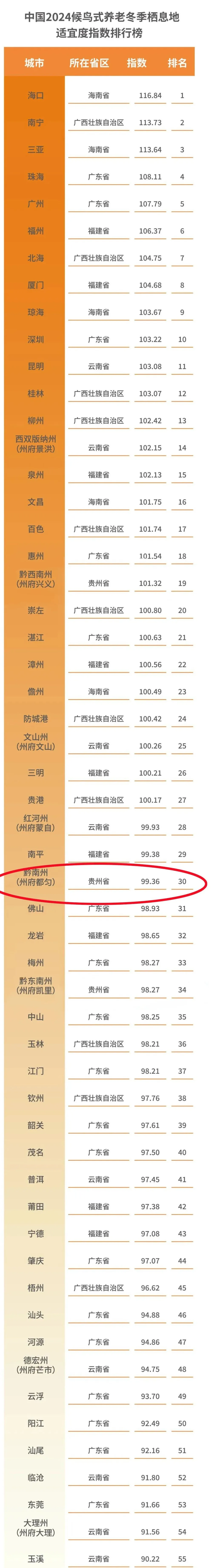 近日,上海交通大学发布《2024中国候鸟式养老冬季栖息地适宜度指数》,这是自2019年以来第六次冬季指数发布。贵州省中,黔西南州(州府兴义)名列第十九,黔南州(州府都匀)名列第三十名,黔东南州(州府凯里)名列第三十四。